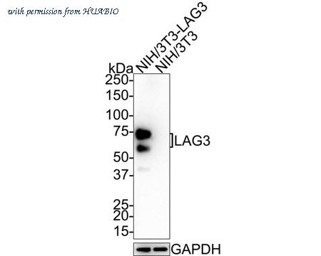 Western blot analysis of LAG-3 on different lysates with Rabbit anti-LAG-3 antibody (HA721344) at 1/2,000 dilution. Lane 1: NIH/3T3 transfected with LAG3 expression vector, whole cell lysate Lane 2: NIH/3T3 cell lysate Lysates/proteins at 20 µg/Lane. Predicted band size: 57.4 kDa Observed band size: 55/70 kDa (Glycosylation) Exposure time: 1 minute 10 seconds; 4-20% SDS-PAGE gel. Proteins were transferred to a PVDF membrane and blocked with 5% NFDM/TBST for 1 hour at room temperature. The primary antibody (HA721344) at 1/2,000 dilution was used in 5% NFDM/TBST at room temperature for 2 hours. Goat Anti-Rabbit IgG - HRP Secondary Antibody (HA1001) at 1:200,000 dilution was used for 1 hour at room temperature.