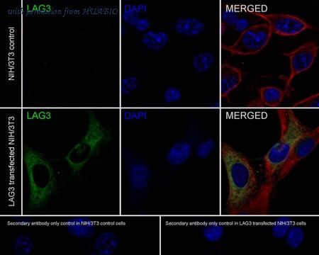 Immunocytochemistry analysis of NIH/3T3 cells transfected with or without LAG3 labeling LAG-3 with Rabbit anti-LAG-3 antibody (HA721346) at 1/100 dilution. Cells were fixed in 4% paraformaldehyde for 10 minutes at 37 ℃, permeabilized with 0.1% Triton X-100 in PBS for 15 minutes, and then blocked with 1% BSA for 30 minutes at room temperature. Cells were then incubated with Rabbit anti-LAG-3 antibody (HA721346) at 1/100 dilution in 2% negative goat serum overnight at 4 ℃. Goat Anti-Rabbit IgG H&L (iFluor™ 488, HA1121) was used as the secondary antibody at 1/1,000 dilution. Nuclear DNA was labelled in blue with DAPI. Beta tubulin (M1305-2, red) was stained at 1/100 dilution overnight at +4℃. Goat Anti-Mouse IgG H&L (iFluor™ 594, HA1126) was used as the secondary antibody at 1/1,000 dilution.