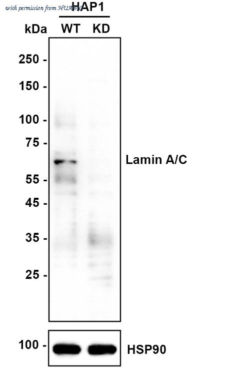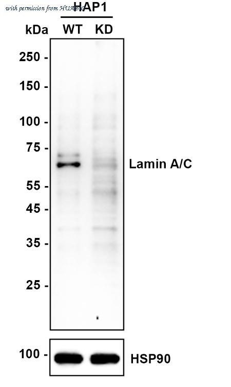 Western blot analysis of Lamin A + Lamin C on different lysates with Mouse anti-Lamin A + Lamin C antibody (HA601274) at 1/5,000 dilution. Lane 1: HAP1-parental cell lysate Lane 2: HAP1-Lamin A + Lamin C KD cell lysate Lysates/proteins at 10 µg/Lane. Predicted band size: 74/65 kDa Observed band size: 74/65 kDa Exposure time: 3 minutes; ECL: K1801; 4-20% SDS-PAGE gel. Proteins were transferred to a PVDF membrane and blocked with 5% NFDM/TBST for 1 hour at room temperature. The primary antibody (HA601274) at 1/5,000 dilution was used in primary antibody dilution (K1803) at 4℃ overnight. Goat Anti-Mouse IgG - HRP Secondary Antibody (HA1006) at 1/50,000 dilution was used for 1 hour at room temperature.