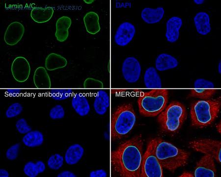 Immunocytochemistry analysis of HeLa cells labeling Lamin A + Lamin C with Rabbit anti-Lamin A + Lamin C antibody (HA750991) at 1/200 dilution. Cells were fixed in 4% paraformaldehyde for 10 minutes at 37 ℃, permeabilized with 0.05% Triton X-100 in PBS for 20 minutes, and then blocked with 2% negative goat serum for 30 minutes at room temperature. Cells were then incubated with Rabbit anti-Lamin A + Lamin C antibody (HA750991) at 1/200 dilution in 2% negative goat serum overnight at 4 ℃. Goat Anti-Rabbit IgG H&L (iFluor™ 488, HA1121) was used as the secondary antibody at 1/1,000 dilution. Nuclear DNA was labelled in blue with DAPI. Beta tubulin (M1305-2, red) was stained at 1/200 dilution overnight at +4℃. Goat Anti-Mouse IgG H&L (iFluor™ 594, HA1126) was used as the secondary antibody at 1/1,000 dilution.