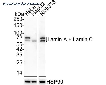 Western blot analysis of Lamin A + Lamin C on different lysates with Mouse anti-Lamin A + Lamin C antibody (HA600093) at 1/2,000 dilution. Lane 1: HeLa cell lysate Lane 2: HepG2 cell lysate Lane 3: NIH/3T3 cell lysate Lysates/proteins at 20 µg/Lane. Predicted band size: 74/65 kDa Observed band size: 74/65 kDa Exposure time: 1 minute 2 seconds; 4-20% SDS-PAGE gel. Proteins were transferred to a PVDF membrane and blocked with 5% NFDM/TBST for 1 hour at room temperature. The primary antibody (HA600093) at 1/2,000 dilution was used in 5% NFDM/TBST at 4℃ overnight. Goat Anti-Mouse IgG - HRP Secondary Antibody (HA1006) at 1/50,000 dilution was used for 1 hour at room temperature.