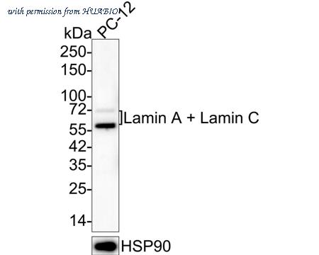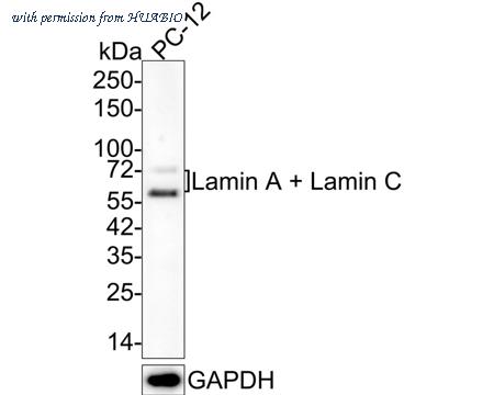 Western blot analysis of Lamin A + Lamin C on PC-12 cell lysates with Mouse anti-Lamin A + Lamin C antibody (HA601274) at 1/2,000 dilution. Lysates/proteins at 10 µg/Lane. Predicted band size: 74/65 kDa Observed band size: 74/65 kDa Exposure time: 4 minutes 22 seconds; 4-20% SDS-PAGE gel. Proteins were transferred to a PVDF membrane and blocked with 5% NFDM/TBST for 1 hour at room temperature. The primary antibody (HA601274) at 1/2,000 dilution was used in 5% NFDM/TBST at 4℃ overnight. Goat Anti-Mouse IgG - HRP Secondary Antibody (HA1006) at 1/50,000 dilution was used for 1 hour at room temperature.