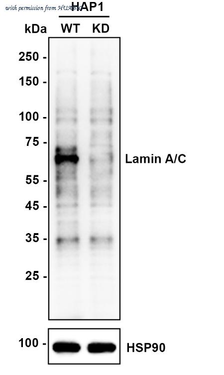 Western blot analysis of Lamin A + Lamin C on different lysates with Mouse anti-Lamin A + Lamin C antibody (HA610149) at 1/5,000 dilution. Lane 1: HAP1-parental cell lysate Lane 2: HAP1-Lamin A + Lamin C KD cell lysate Lysates/proteins at 10 µg/Lane. Predicted band size: 74/65 kDa Observed band size: 74/65 kDa Exposure time: 3 minutes; ECL: K1801; 4-20% SDS-PAGE gel. Proteins were transferred to a PVDF membrane and blocked with 5% NFDM/TBST for 1 hour at room temperature. The primary antibody (HA610149) at 1/5,000 dilution was used in primary antibody dilution (K1803) at 4℃ overnight. Goat Anti-Mouse IgG - HRP Secondary Antibody (HA1006) at 1/50,000 dilution was used for 1 hour at room temperature.