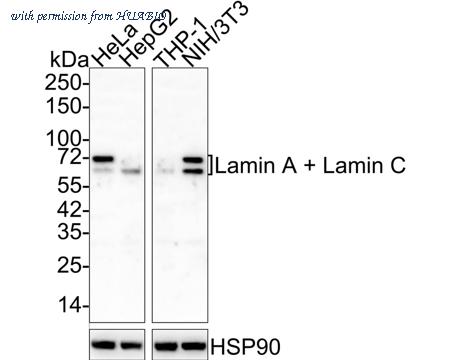 Western blot analysis of Lamin A + Lamin C on different lysates with Mouse anti-Lamin A + Lamin C antibody (HA610149) at 1/2,000 dilution. Lane 1: HeLa cell lysate Lane 2: HepG2 cell lysate Lane 3: THP-1 cell lysate Lane 4: NIH/3T3 cell lysate Lysates/proteins at 20 µg/Lane. Predicted band size: 74/65 kDa Observed band size: 74/65 kDa Exposure time: 1 minute 2 seconds; 4-20% SDS-PAGE gel. Proteins were transferred to a PVDF membrane and blocked with 5% NFDM/TBST for 1 hour at room temperature. The primary antibody (HA610149) at 1/2,000 dilution was used in 5% NFDM/TBST at 4℃ overnight. Goat Anti-Mouse IgG - HRP Secondary Antibody (HA1006) at 1/50,000 dilution was used for 1 hour at room temperature.