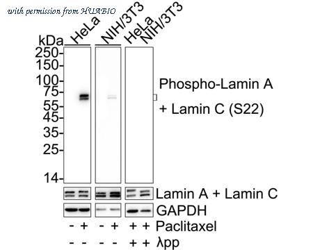 Western blot analysis of Phospho-Lamin A + Lamin C (S22) on different lysates with Rabbit anti-Phospho-Lamin A + Lamin C (S22) antibody (HA723339) at 1/2,000 dilution and pan Lamin A + Lamin C antibody (ET7110-12) at 1/2,000 dilution. Lane 1: HeLa cell lysate Lane 2: HeLa treated with 100nM paclitaxel for 20 hours cell lysate Lane 3: NIH/3T3 cell lysate Lane 4: NIH/3T3 treated with 100nM paclitaxel for 20 hours cell lysate Lane 5: HeLa treated with 100nM paclitaxel for 20 hours cell lysate, then the membrane treated with λpp for 1 hour Lane 5: NIH/3T3 treated with 100nM paclitaxel for 20 hours cell lysate, then the membrane treated with λpp for 1 hour Lysates/proteins at 20 µg/Lane. Predicted band size: 74 kDa Observed band size: 70/65 kDa Exposure time: Lane 1-2: 3 seconds; Lane 3-6: 3 minutes; ECL: K1801; 4-20% SDS-PAGE gel. Proteins were transferred to a PVDF membrane and blocked with 5% NFDM/TBST for 1 hour at room temperature. The primary antibody (HA723339) at 1/2,000 dilution and pan Lamin A + Lamin C antibody (ET7110-12) at 1/2,000 dilution were used in 5% NFDM/TBST at 4℃ overnight. Goat Anti-Rabbit IgG - HRP Secondary Antibody (HA1001) at 1/50,000 dilution was used for 1 hour at room temperature.