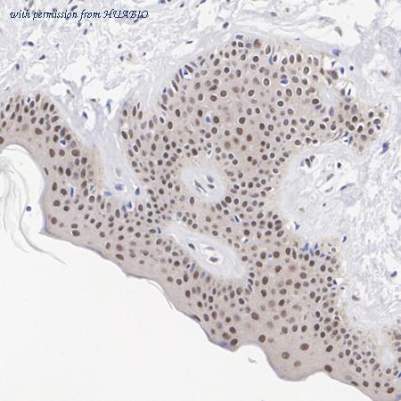 Immunohistochemical analysis of paraffin-embedded human skin tissue with Rabbit anti-Phospho-Lamin A + Lamin C (S22) antibody (HA751409) at 1/2,000 dilution. The section was pre-treated using heat mediated antigen retrieval with Tris-EDTA buffer (pH 9.0) for 20 minutes. The tissues were blocked in 1% BSA for 20 minutes at room temperature, washed with ddH2O and PBS, and then probed with the primary antibody (HA751409) at 1/2,000 dilution for 1 hour at room temperature. The detection was performed using an HRP conjugated compact polymer system. DAB was used as the chromogen. Tissues were counterstained with hematoxylin and mounted with DPX.