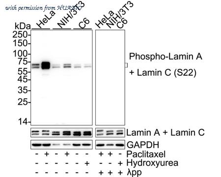 Western blot analysis of Phospho-Lamin A + Lamin C (S22) on different lysates with Rabbit anti-Phospho-Lamin A + Lamin C (S22) antibody (HA723340) at 1/2,000 dilution and pan Lamin A + Lamin C antibody (ET7110-12) at 1/2,000 dilution. Lane 1: HeLa cell lysate Lane 2: HeLa treated with 100nM paclitaxel for 20 hours cell lysate Lane 3: NIH/3T3 cell lysate Lane 4: NIH/3T3 treated with 100nM paclitaxel for 20 hours cell lysate Lane 5: C6 cell lysate Lane 6: C6 treated with 4mM hydroxyurea for 20 hours cell lysate Lane 7: HeLa treated with 100nM paclitaxel for 20 hours cell lysate, then the membrane treated with λpp for 1 hour Lane 8: NIH/3T3 treated with 100nM paclitaxel for 20 hours cell lysate, then the membrane treated with λpp for 1 hour Lane 9: C6 treated with 4mM hydroxyurea for 20 hours cell lysate, then the membrane treated with λpp for 1 hour Lysates/proteins at 20 µg/Lane. Predicted band size: 74 kDa Observed band size: 70/65 kDa Exposure time: 4 seconds; ECL: K1801; 4-20% SDS-PAGE gel. Proteins were transferred to a PVDF membrane and blocked with 5% NFDM/TBST for 1 hour at room temperature. The primary antibody (HA723340) at 1/2,000 dilution and pan Lamin A + Lamin C antibody (ET7110-12) at 1/2,000 dilution were used in 5% NFDM/TBST at 4℃ overnight. Goat Anti-Rabbit IgG - HRP Secondary Antibody (HA1001) at 1/50,000 dilution was used for 1 hour at room temperature.