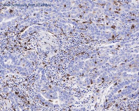 Immunohistochemical analysis of paraffin-embedded human stomach cancer tissue with Mouse anti-Lysozyme antibody (EM1901-99) at 1/1,000 dilution. The section was pre-treated using heat mediated antigen retrieval with Tris-EDTA buffer (pH 9.0) for 20 minutes. The tissues were blocked in 1% BSA for 20 minutes at room temperature, washed with ddH2O and PBS, and then probed with the primary antibody (EM1901-99) at 1/1,000 dilution for 1 hour at room temperature. The detection was performed using an HRP conjugated compact polymer system. DAB was used as the chromogen. Tissues were counterstained with hematoxylin and mounted with DPX.