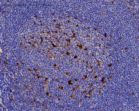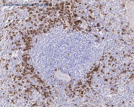 Immunohistochemical analysis of paraffin-embedded human spleen tissue with Mouse anti-Lysozyme antibody (EM1901-99) at 1/1,000 dilution. The section was pre-treated using heat mediated antigen retrieval with Tris-EDTA buffer (pH 9.0) for 20 minutes. The tissues were blocked in 1% BSA for 20 minutes at room temperature, washed with ddH2O and PBS, and then probed with the primary antibody (EM1901-99) at 1/1,000 dilution for 1 hour at room temperature. The detection was performed using an HRP conjugated compact polymer system. DAB was used as the chromogen. Tissues were counterstained with hematoxylin and mounted with DPX.