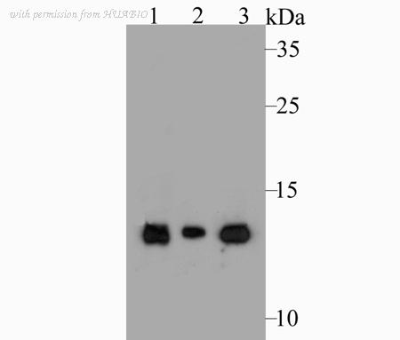 Western blot analysis of Lysozyme on different lysates. Proteins were transferred to a PVDF membrane and blocked with 5% BSA in PBS for 1 hour at room temperature. The primary antibody was used at a 1:500 dilution in 5% BSA at room temperature for 2 hours. Goat Anti-Rabbit IgG - HRP Secondary Antibody (HA1001) at 1:5,000 dilution was used for 1 hour at room temperature. Positive control: Lane 1: HL-60 cell lysate Lane 2: Mouse kidney tissue lysate Lane 3: Rat kidney tissue lysate