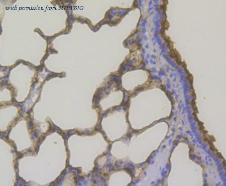 Immunohistochemical analysis of paraffin-embedded rat lung tissue using anti-Lysozyme antibody. The section was pre-treated using heat mediated antigen retrieval with Tris-EDTA buffer (pH 8.0-8.4) for 20 minutes.The tissues were blocked in 5% BSA for 30 minutes at room temperature, washed with ddH2O and PBS, and then probed with the antibody (ER1803-88) at 1/200 dilution, for 30 minutes at room temperature and detected using an HRP conjugated compact polymer system. DAB was used as the chromogen. Counter stained with hematoxylin and mounted with DPX.