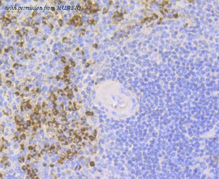 Immunohistochemical analysis of paraffin-embedded human spleen tissue with Rabbit anti-Lysozyme antibody (HA750170) at 1/500 dilution. The section was pre-treated using heat mediated antigen retrieval with Tris-EDTA buffer (pH 9.0) for 20 minutes. The tissues were blocked in 1% BSA for 20 minutes at room temperature, washed with ddH2O and PBS, and then probed with the primary antibody (HA750170) at 1/500 dilution for 1 hour at room temperature. The detection was performed using an HRP conjugated compact polymer system. DAB was used as the chromogen. Tissues were counterstained with hematoxylin and mounted with DPX.