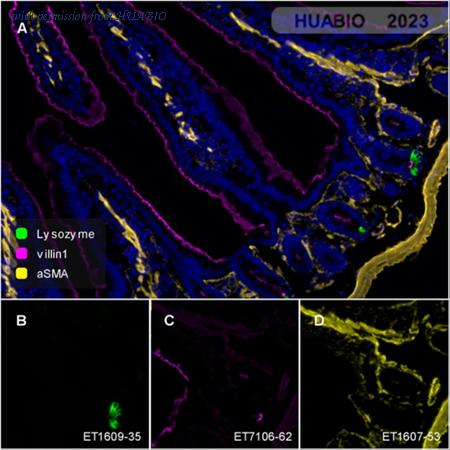 Fluorescence multiplex immunohistochemical analysis of mouse small intestine (Formalin/PFA-fixed paraffin-embedded sections). Panel A: the merged image of anti-Lysozyme (ET1609-35, Green), anti-villin1 (ET7106-62, Magenta) and anti-aSMA (ET1607-53, Yellow) on mouse small intestine. HRP Conjugated UltraPolymer Goat Polyclonal Antibody HA1119/HA1120 was used as a secondary antibody. The immunostaining was performed with the Sequential Immuno-staining Kit (IRISKit™MH010101, www.luminiris.cn). The section was incubated in three rounds of staining: in the order of ET1609-35 (1/2,000 dilution), ET7106-62 (1/5,000 dilution) and ET1607-53 (1/10,000 dilution) for 20 mins at room temperature. Each round was followed by a separate fluorescent tyramide signal amplification system. Heat mediated antigen retrieval with Tris-EDTA buffer (pH 9.0) for 30 mins at 95℃. DAPI (blue) was used as a nuclear counter stain. Image acquisition was performed with Olympus VS200 Slide Scanner.