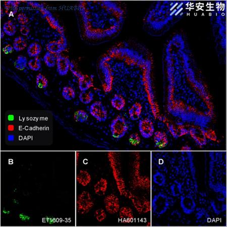 Fluorescence multiplex immunohistochemical analysis of mouse small intestine (Formalin/PFA-fixed paraffin-embedded sections). Panel A: the merged image of anti-E-Cadherin (HA601143, Red) and anti-Lysozyme (ET1609-35, Green) on small intestine. HRP Conjugated UltraPolymer Goat Polyclonal Antibody HA1119/HA1120 was used as a secondary antibody. The immunostaining was performed with the Sequential Immuno-staining Kit (IRISKit™MH010101, www.luminiris.cn). The section was incubated in two rounds of staining: in the order of HA601143 (1/4,000 dilution) and ET1609-35 (1/2,000 dilution) for 20 mins at room temperature. Each round was followed by a separate fluorescent tyramide signal amplification system. Heat mediated antigen retrieval with Tris-EDTA buffer (pH 9.0) for 30 mins at 95℃. DAPI (blue) was used as a nuclear counter stain. Image acquisition was performed with Zeiss Observer 7 Inverted Fluorescence Microscope.