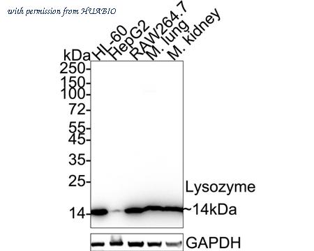 Western blot analysis of Lysozyme on different lysates with Rabbit anti-Lysozyme antibody (HA750170) at 1/2,000 dilution. Lane 1: HL-60 cell lysate (20 µg/Lane) Lane 2: HepG2 cell lysate (20 µg/Lane) Lane 3: RAW264.7 cell lysate (20 µg/Lane) Lane 4: Mouse lung tissue lysate (40 µg/Lane) Lane 5: Mouse kidney tissue lysate (40 µg/Lane) Predicted band size: 17 kDa Observed band size: 14 kDa Exposure time: 6 seconds; ECL: K1801; 4-20% SDS-PAGE gel. Proteins were transferred to a PVDF membrane and blocked with 5% NFDM/TBST for 1 hour at room temperature. The primary antibody (HA750170) at 1/2,000 dilution was used in 5% NFDM/TBST at 4℃ overnight. Goat Anti-Rabbit IgG - HRP Secondary Antibody (HA1001) at 1/50,000 dilution was used for 1 hour at room temperature.