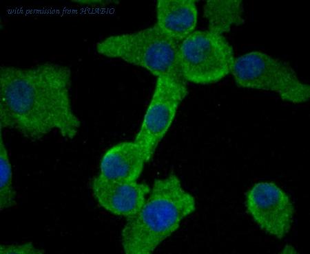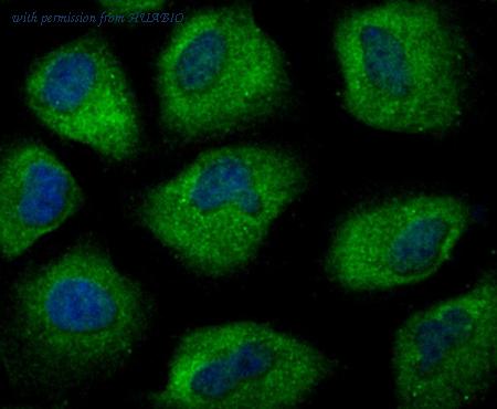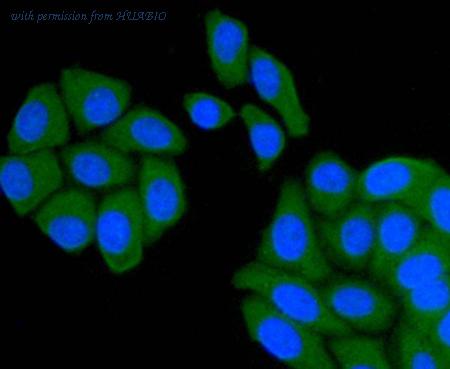 Immunocytochemical staining of HepG2 cells using anti-Smad2 rabbit polyclonal antibody.