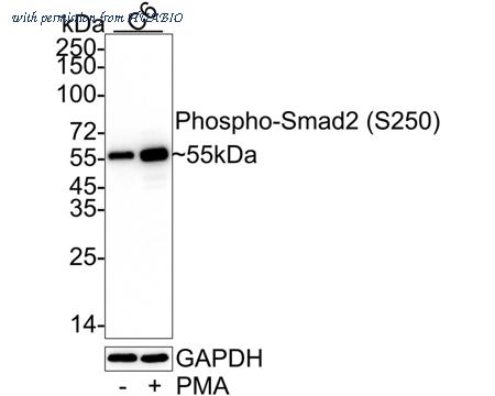 Western blot analysis of Phospho-Smad2 (S250) on different lysates with Rabbit anti-Phospho-Smad2 (S250) antibody (HA750291) at 1/5,000 dilution. Lane 1: C6 cell lysate Lane 2: C6 treated with 200nM PMA for 30 minutes cell lysate Lysates/proteins at 20 µg/Lane. Predicted band size: 52 kDa Observed band size: 55 kDa Exposure time: 2 minutes; ECL: K1801; 4-20% SDS-PAGE gel. Proteins were transferred to a PVDF membrane and blocked with 5% NFDM/TBST for 1 hour at room temperature. The primary antibody (HA750291) at 1/5,000 dilution was used in 5% NFDM/TBST at 4℃ overnight. Goat Anti-Rabbit IgG - HRP Secondary Antibody (HA1001) at 1/50,000 dilution was used for 1 hour at room temperature.