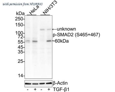 Western blot analysis of Phospho-SMAD2 (S465+467) on different lysates with Rabbit anti-Phospho-SMAD2 (S465+467) antibody (HA751026) at 1/1,000 dilution. Lane 1: HeLa cell lysate Lane 2: HeLa starved overnight then treated with 10ng/mL TGF-β1 for 30 minutes cell lysate Lane 3: NIH/3T3 cell lysate Lane 4: NIH/3T3 starved overnight then treated with 10ng/mL TGF-β1 for 30 minutes cell lysate Lysates/proteins at 20 µg/Lane. Predicted band size: 52/48 kDa Observed band size: 60 kDa Exposure time: 1 minute 20 seconds; ECL: K1802; 4-20% SDS-PAGE gel. Proteins were transferred to a PVDF membrane and blocked with 5% NFDM/TBST for 1 hour at room temperature. The primary antibody (HA751026) at 1/1,000 dilution was used in 5% NFDM/TBST at 4℃ overnight. Goat Anti-Rabbit IgG - HRP Secondary Antibody (HA1001) at 1/50,000 dilution was used for 1 hour at room temperature.