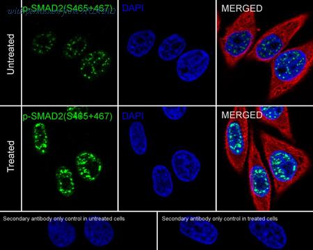 Immunocytochemistry analysis of HeLa cells treated with or without 20ng/mL TGF-β1 for 15 minutes labeling Phospho-SMAD2 (S465+467) with Rabbit anti-Phospho-SMAD2 (S465+467) antibody (HA751026) at 1/500 dilution. Cells were fixed in 4% paraformaldehyde for 20 minutes at room temperature, permeabilized with 0.1% Triton X-100 in PBS for 5 minutes at room temperature, then blocked with 1% BSA in 10% negative goat serum for 1 hour at room temperature. Cells were then incubated with Rabbit anti-Phospho-SMAD2 (S465+467) antibody (HA751026) at 1/500 dilution in 1% BSA in PBST overnight at 4 ℃. Goat Anti-Rabbit IgG H&L (iFluor™ 488, HA1121) was used as the secondary antibody at 1/1,000 dilution. PBS instead of the primary antibody was used as the secondary antibody only control. Nuclear DNA was labelled in blue with DAPI. Beta tubulin (M1305-2, red) was stained at 1/100 dilution overnight at +4℃. Goat Anti-Mouse IgG H&L (iFluor™ 594, HA1126) was used as the secondary antibody at 1/1,000 dilution.