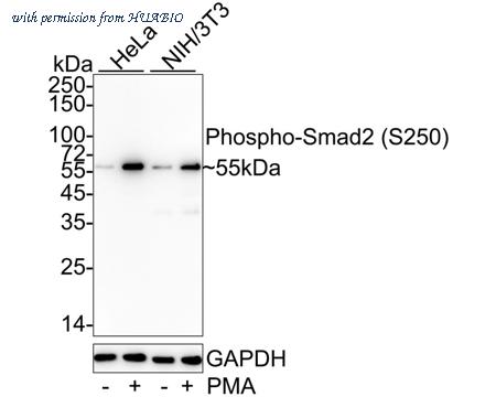 Western blot analysis of Phospho-Smad2 (S250) on different lysates with Rabbit anti-Phospho-Smad2 (S250) antibody (HA750291) at 1/5,000 dilution. Lane 1: HeLa cell lysate Lane 2: HeLa treated with 200nM PMA for 30 minutes cell lysate Lane 3: NIH/3T3 cell lysate Lane 4: NIH/3T3 treated with 200nM PMA for 30 minutes cell lysate Lysates/proteins at 20 µg/Lane. Predicted band size: 52 kDa Observed band size: 55 kDa Exposure time: 30 seconds; ECL: K1801; 4-20% SDS-PAGE gel. Proteins were transferred to a PVDF membrane and blocked with 5% NFDM/TBST for 1 hour at room temperature. The primary antibody (HA750291) at 1/5,000 dilution was used in 5% NFDM/TBST at 4℃ overnight. Goat Anti-Rabbit IgG - HRP Secondary Antibody (HA1001) at 1/50,000 dilution was used for 1 hour at room temperature.