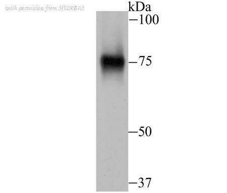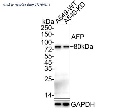 Western blot analysis of AFP on different lysates with Mouse anti-AFP antibody (EM1701-31) at 1/1,000 dilution. Lane 1: A549-WT cell lysate (10 µg/Lane) Lane 2: A549-KD AFP cell lysate (10 µg/Lane) Predicted band size: 69 kDa Observed band size: 80 kDa Exposure time: 30 seconds; ECL: K1801; 4-20% SDS-PAGE gel. Proteins were transferred to a PVDF membrane and blocked with 5% NFDM/TBST for 1 hour at room temperature. The primary antibody (EM1701-31) at 1/1,000 dilution was used in 5% NFDM/TBST at 4℃ overnight. Goat Anti-Mouse IgG - HRP Secondary Antibody (HA1006) at 1/50,000 dilution was used for 1 hour at room temperature.