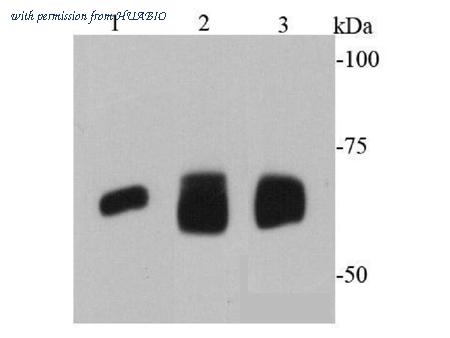 Western blot analysis of AFP on different lysates using anti-AFP antibody at 1/1,000 dilution. Postive control: Lane 1: MCF-7 cell lysate Lane 2: PC-12 cell lysate Lane 3: Human liver tissue lysate