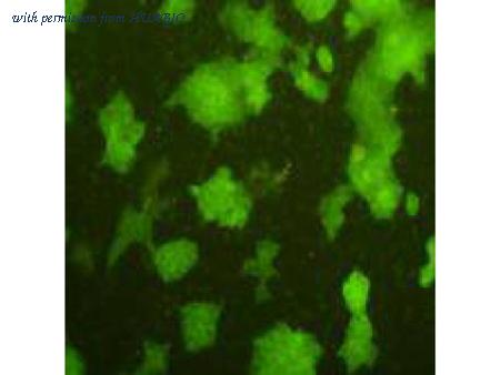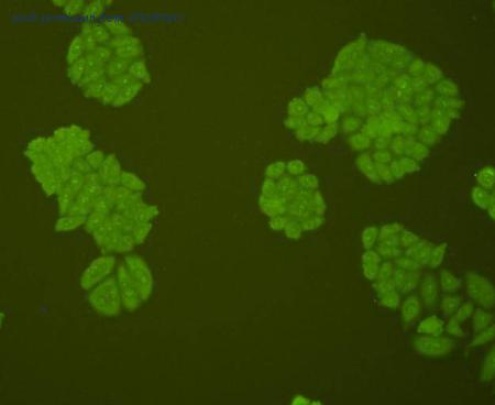 ICC staining AFP in HepG2 cells (green). Cells were fixed in paraformaldehyde, permeabilised with 0.25% Triton X100/PBS.