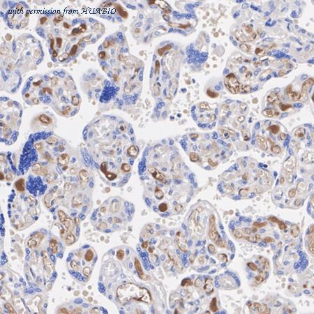 Immunohistochemical analysis of paraffin-embedded human placenta tissue with Rabbit anti-AFP antibody (HA751430) at 1/20,000 dilution. The section was pre-treated using heat mediated antigen retrieval with Tris-EDTA buffer (pH 9.0) for 20 minutes. The tissues were blocked in 1% BSA for 20 minutes at room temperature, washed with ddH2O and PBS, and then probed with the primary antibody (HA751430) at 1/20,000 dilution for 1 hour at room temperature. The detection was performed using an HRP conjugated compact polymer system. DAB was used as the chromogen. Tissues were counterstained with hematoxylin and mounted with DPX.