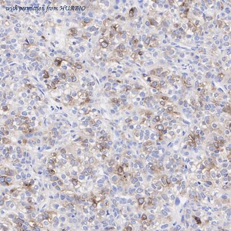 Immunohistochemical analysis of paraffin-embedded human poorly differentiated hepatocellular carcinoma tissue with Rabbit anti-AFP antibody (HA751430) at 1/20,000 dilution. The section was pre-treated using heat mediated antigen retrieval with Tris-EDTA buffer (pH 9.0) for 20 minutes. The tissues were blocked in 1% BSA for 20 minutes at room temperature, washed with ddH2O and PBS, and then probed with the primary antibody (HA751430) at 1/20,000 dilution for 1 hour at room temperature. The detection was performed using an HRP conjugated compact polymer system. DAB was used as the chromogen. Tissues were counterstained with hematoxylin and mounted with DPX.