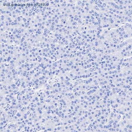 Immunohistochemical analysis of paraffin-embedded human well-differentiated hepatocellular carcinoma tissue (negative) with Rabbit anti-AFP antibody (HA721238) at 1/200 dilution. The section was pre-treated using heat mediated antigen retrieval with Tris-EDTA buffer (pH 9.0) for 20 minutes. The tissues were blocked in 1% BSA for 20 minutes at room temperature, washed with ddH2O and PBS, and then probed with the primary antibody (HA721238) at 1/200 dilution for 1 hour at room temperature. The detection was performed using an HRP conjugated compact polymer system. DAB was used as the chromogen. Tissues were counterstained with hematoxylin and mounted with DPX.