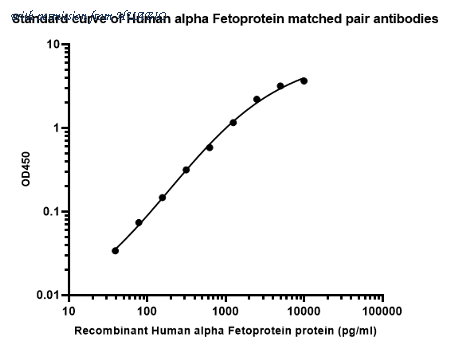 Sandwich ELISA analysis of Human alpha Fetoprotein matched pair antibodies Capture: HA723644, Human alpha Fetoprotein Rabbit mAb [PSH14-53] Detector: HA723647, Human alpha Fetoprotein Rabbit mAb [PSH14-55] Elisa assay was performed by coating wells of a 96-well plate with 100 µl per well of capture antibody (HA723644) diluted in carbonate/bicarbonate buffer, at a concentration of 2ug/ml overnight at 4℃. Wells of the plate were washed, blocked with 150 µl 0.05% tween-20 1% BSA blocking buffer, and incubated with serial diluted Recombinant Human alpha Fetoprotein protein (HA210967) starting from 10000 pg/ml to 0 pg/ml and detect antibody (HA723647, Biotin, 0.2 µg/ml) for 1 hour at 30℃ with shaking. Then the plate was washed and incubated with 100 µl per well of SA-HRP for 0.5 hour at 30℃ with shaking. Detection was performed using an Ultra TMB Substrate for 10 minutes at room temperature in the dark. The reaction was stopped with sulfuric acid and absorbances were read on a spectrophotometer at 450 nm.