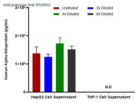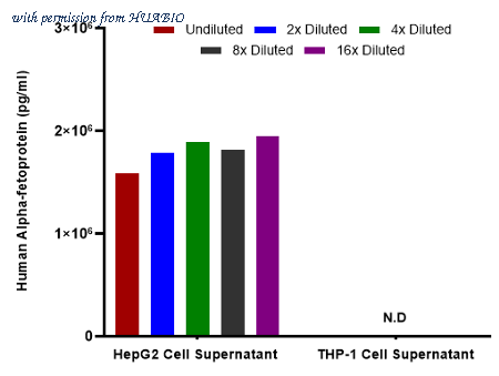 Interpolated concentrations of native Alpha-fetoprotein in human samples. Capture: HA723644, Human alpha Fetoprotein Rabbit mAb [PSH14-53] Detector: HA723647, Human alpha Fetoprotein Rabbit mAb [PSH14-55] Interpolated concentration of native Alpha-fetoprotein was measured in duplicate at different sample concentrations and interpolated from the Alpha-fetoprotein standard curves. The interpolated dilution factor corrected values were plotted (mean +/- SD, n=2). The mean Alpha-fetoprotein concentration was determined to be 1.8 ug/mL in Hep G2 cell supernatant. There was no detectable signal in THP-1 cell supernatant.