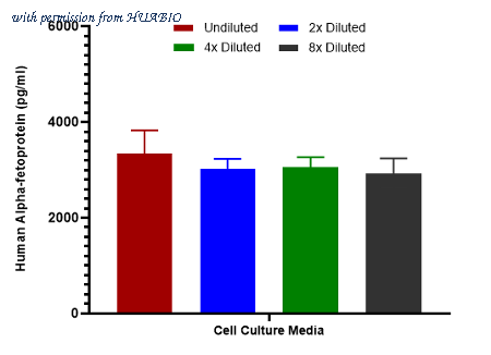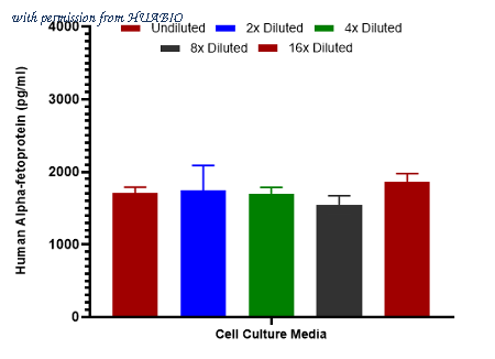 Interpolated concentrations of spiked Alpha-fetoprotein in cell culture media samples. Capture: HA723644, Human alpha Fetoprotein Rabbit mAb [PSH14-53] Detector: HA723645, Human alpha Fetoprotein Rabbit mAb [PSH14-54] The concentrations of Alpha-fetoprotein were measured in duplicates, interpolated from the Alpha-fetoprotein standard curves and corrected for sample dilution. Undiluted samples are as follows: cell culture media 50%. The interpolated dilution factor corrected values are plotted (mean +/- SD, n=2).