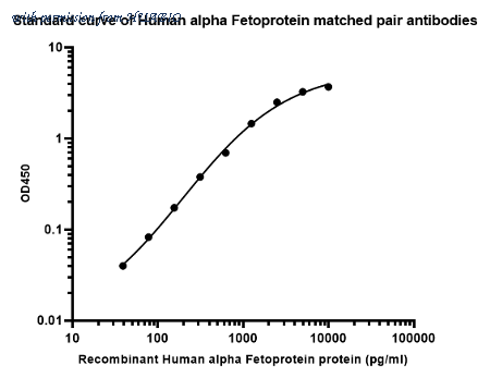 Sandwich ELISA analysis of Human alpha Fetoprotein matched pair antibodies Capture: HA723644, Human alpha Fetoprotein Rabbit mAb [PSH14-53] Detector: HA723645, Human alpha Fetoprotein Rabbit mAb [PSH14-55] Elisa assay was performed by coating wells of a 96-well plate with 100 µl per well of capture antibody (HA723644) diluted in carbonate/bicarbonate buffer, at a concentration of 2ug/ml overnight at 4℃. Wells of the plate were washed, blocked with 150 µl 0.05% tween-20 1% BSA blocking buffer, and incubated with serial diluted Recombinant Human alpha Fetoprotein protein (HA210967) starting from 10000 pg/ml to 0 pg/ml and detect antibody (HA723647, Biotin, 0.2 µg/ml) for 1 hour at 30℃ with shaking. Then the plate was washed and incubated with 100 µl per well of SA-HRP for 0.5 hour at 30℃ with shaking. Detection was performed using an Ultra TMB Substrate for 10 minutes at room temperature in the dark. The reaction was stopped with sulfuric acid and absorbances were read on a spectrophotometer at 450 nm.