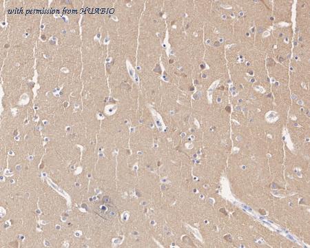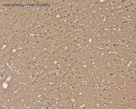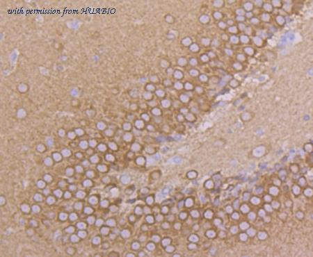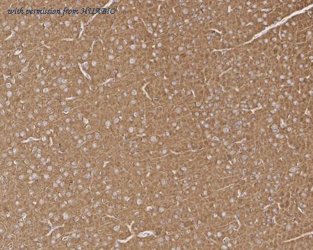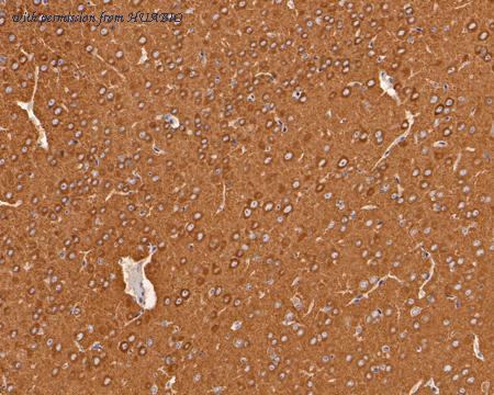 Immunohistochemical analysis of paraffin-embedded mouse brain tissue with Mouse anti-Dynamin 1 antibody (HA601325) at 1/1,000 dilution. The section was pre-treated using heat mediated antigen retrieval with Tris-EDTA buffer (pH 9.0) for 20 minutes. The tissues were blocked in 1% BSA for 20 minutes at room temperature, washed with ddH2O and PBS, and then probed with the primary antibody (HA601325) at 1/1,000 dilution for 1 hour at room temperature. The detection was performed using an HRP conjugated compact polymer system. DAB was used as the chromogen. Tissues were counterstained with hematoxylin and mounted with DPX.