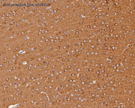 Immunohistochemical analysis of paraffin-embedded mouse brain tissue with Mouse anti-Dynamin 1 antibody (EM1901-43) at 1/1,000 dilution. The section was pre-treated using heat mediated antigen retrieval with Tris-EDTA buffer (pH 9.0) for 20 minutes. The tissues were blocked in 1% BSA for 20 minutes at room temperature, washed with ddH2O and PBS, and then probed with the primary antibody (EM1901-43) at 1/1,000 dilution for 1 hour at room temperature. The detection was performed using an HRP conjugated compact polymer system. DAB was used as the chromogen. Tissues were counterstained with hematoxylin and mounted with DPX.