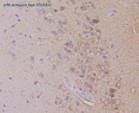 Immunohistochemical analysis of paraffin-embedded human brain tissue with Mouse anti-Dynamin 1 antibody (HA601325) at 1/1,000 dilution. The section was pre-treated using heat mediated antigen retrieval with Tris-EDTA buffer (pH 9.0) for 20 minutes. The tissues were blocked in 1% BSA for 20 minutes at room temperature, washed with ddH2O and PBS, and then probed with the primary antibody (HA601325) at 1/1,000 dilution for 1 hour at room temperature. The detection was performed using an HRP conjugated compact polymer system. DAB was used as the chromogen. Tissues were counterstained with hematoxylin and mounted with DPX.