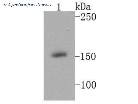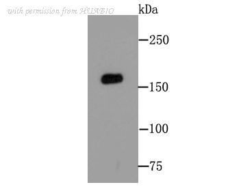 Western blot analysis of MSH6 on A549 cell lysates with Rabbit anti-MSH6 antibody (ET1604-39) at 1/1,000 dilution. Lysates/proteins at 20 µg/Lane. Predicted band size: 153 kDa Observed band size: 153 kDa Exposure time: 18 seconds; ECL: K1801; 4-20% SDS-PAGE gel. Proteins were transferred to a PVDF membrane and blocked with 5% NFDM/TBST for 1 hour at room temperature. The primary antibody (ET1604-39) at 1/1,000 dilution was used in 5% NFDM/TBST at 4℃ overnight. Goat Anti-Rabbit IgG - HRP Secondary Antibody (HA1001) at 1/50,000 dilution was used for 1 hour at room temperature.