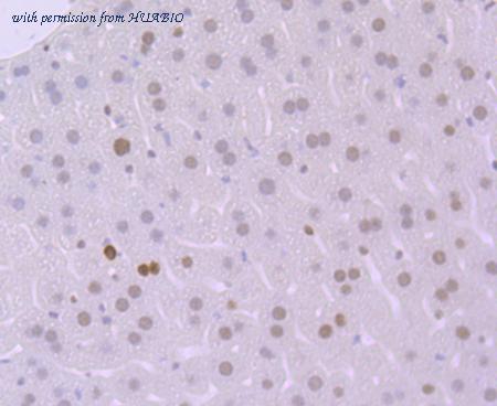 Immunohistochemical analysis of paraffin-embedded mouse liver tissue using anti-MSH6 antibody. Counter stained with hematoxylin.