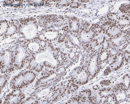 Immunohistochemical analysis of paraffin-embedded human colon carcinoma tissue with Mouse anti-MSH6 antibody (HA601177) at 1/1,000 dilution. The section was pre-treated using heat mediated antigen retrieval with sodium citrate buffer (pH 6.0) (high pressure) for 2 minutes. The tissues were blocked in 1% BSA for 20 minutes at room temperature, washed with ddH2O and PBS, and then probed with the primary antibody (HA601177) at 1/1,000 dilution for 1 hour at room temperature. The detection was performed using an HRP conjugated compact polymer system. DAB was used as the chromogen. Tissues were counterstained with hematoxylin and mounted with DPX.