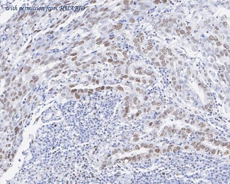 Immunohistochemical analysis of paraffin-embedded human stomach carcinoma tissue with Mouse anti-MSH6 antibody (HA610061) at 1/1,000 dilution. The section was pre-treated using heat mediated antigen retrieval with sodium citrate buffer (pH 6.0) (high pressure) for 2 minutes. The tissues were blocked in 1% BSA for 20 minutes at room temperature, washed with ddH2O and PBS, and then probed with the primary antibody (HA610061) at 1/1,000 dilution for 1 hour at room temperature. The detection was performed using an HRP conjugated compact polymer system. DAB was used as the chromogen. Tissues were counterstained with hematoxylin and mounted with DPX.