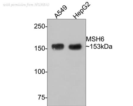 Western blot analysis of MSH6 on different lysates with Rabbit anti-MSH6 antibody (HA721164) at 1/1,000 dilution. Lane 1: A549 cell lysate Lane 2: HepG2 cell lysate Lysates/proteins at 10 µg/Lane. Predicted band size: 153 kDa Observed band size: 153 kDa Exposure time: 2 minutes; 6% SDS-PAGE gel. Proteins were transferred to a PVDF membrane and blocked with 5% NFDM/TBST for 1 hour at room temperature. The primary antibody (HA721164) at 1/1,000 dilution was used in 5% NFDM/TBST at room temperature for 2 hours. Goat Anti-Rabbit IgG - HRP Secondary Antibody (HA1001) at 1:300,000 dilution was used for 1 hour at room temperature.