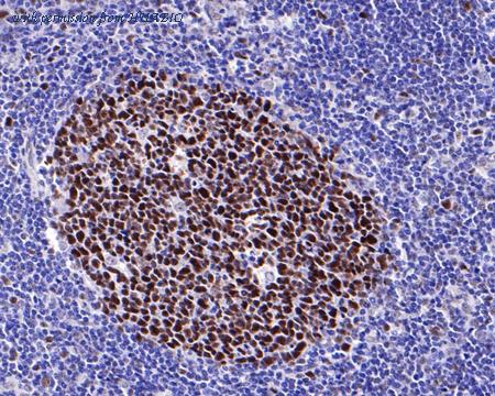 Immunohistochemical analysis of paraffin-embedded human tonsil tissue with Rabbit anti-MSH6 antibody (HA721164) at 1/1,000 dilution. The section was pre-treated using heat mediated antigen retrieval with sodium citrate buffer (pH 6.0) (high pressure) for 2 minutes. The tissues were blocked in 1% BSA for 20 minutes at room temperature, washed with ddH2O and PBS, and then probed with the primary antibody (HA721164) at 1/1,000 dilution for 1 hour at room temperature. The detection was performed using an HRP conjugated compact polymer system. DAB was used as the chromogen. Tissues were counterstained with hematoxylin and mounted with DPX.