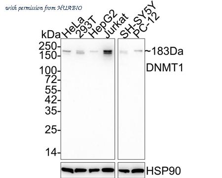 Western blot analysis of DNMT1 on different lysates with Mouse anti-DNMT1 antibody (EM1901-83) at 1/4,000 dilution. Lane 1: HeLa cell lysate Lane 2: 293T cell lysate Lane 3: HepG2 cell lysate Lane 4: Jurkat cell lysate Lane 5: SH-SY5Y cell lysate Lane 6: PC-12 cell lysate Lysates/proteins at 20 µg/Lane. Predicted band size: 183 kDa Observed band size: 183 kDa Exposure time: 3 minutes; ECL: K1801; 4-20% SDS-PAGE gel. Proteins were transferred to a PVDF membrane and blocked with 5% NFDM/TBST for 1 hour at room temperature. The primary antibody (EM1901-83) at 1/4,000 dilution was used in 5% NFDM/TBST at 4℃ overnight. Goat Anti-Mouse IgG - HRP Secondary Antibody (HA1006) at 1/50,000 dilution was used for 1 hour at room temperature.