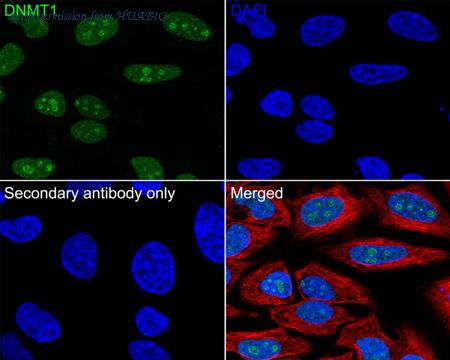 Immunocytochemistry analysis of HeLa cells labeling DNMT1 with Mouse anti-DNMT1 antibody (HA610156) at 1/100 dilution. Cells were fixed in 4% paraformaldehyde for 20 minutes at room temperature, permeabilized with 0.1% Triton X-100 in PBS for 5 minutes at room temperature, then blocked with 1% BSA in 10% negative goat serum for 1 hour at room temperature. Cells were then incubated with Mouse anti-DNMT1 antibody (HA610156) at 1/100 dilution in 1% BSA in PBST overnight at 4 ℃. Goat Anti-Mouse IgG H&L (iFluor™ 488, HA1125) was used as the secondary antibody at 1/1,000 dilution. PBS instead of the primary antibody was used as the secondary antibody only control. Nuclear DNA was labelled in blue with DAPI. beta Tubulin (ET1602-4, red) was stained at 1/100 dilution overnight at +4℃. Goat Anti-Rabbit IgG H&L (iFluor™ 594, HA1122) were used as the secondary antibody at 1/1,000 dilution.