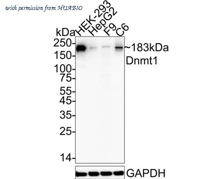 Western blot analysis of Dnmt1 on different lysates with Rabbit anti-Dnmt1 antibody (HA750359) at 1/1,000 dilution. Lane 1: HEK-293 cell lysate Lane 2: HepG2 cell lysate Lane 3: F9 cell lysate Lane 4: C6 cell lysate Lysates/proteins at 20 µg/Lane. Predicted band size: 183 kDa Observed band size: 183 kDa Exposure time: 1 minute; ECL: K1801; 4-20% SDS-PAGE gel. Proteins were transferred to a PVDF membrane and blocked with 5% NFDM/TBST for 1 hour at room temperature. The primary antibody (HA750359) at 1/1,000 dilution was used in 5% NFDM/TBST at 4℃ overnight. Goat Anti-Rabbit IgG - HRP Secondary Antibody (HA1001) at 1/50,000 dilution was used for 1 hour at room temperature.