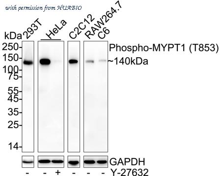 Western blot analysis of Phospho-MYPT1 (T853) on different lysates with Rabbit anti-Phospho-MYPT1 (T853) antibody (HA751236) at 1/2,000 dilution. Lane 1: 293T cell lysate Lane 2: HeLa cell lysate Lane 3: HeLa treated with 10μM Y-27632 for 1 hour cell lysate Lane 4: C2C12 cell lysate Lane 5: RAW264.7 cell lysate Lane 6: C6 cell lysate Lysates/proteins at 20 µg/Lane. Predicted band size: 115 kDa Observed band size: 140 kDa Exposure time: 35 seconds; ECL: K1802; 4-20% SDS-PAGE gel. Proteins were transferred to a PVDF membrane and blocked with 5% NFDM/TBST for 1 hour at room temperature. The primary antibody (HA751236) at 1/2,000 dilution was used in 5% NFDM/TBST at 4℃ overnight. Goat Anti-Rabbit IgG - HRP Secondary Antibody (HA1001) at 1/50,000 dilution was used for 1 hour at room temperature.