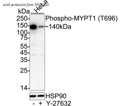 Western blot analysis of Phospho-MYPT1 (T696) on different lysates with Rabbit anti-Phospho-MYPT1 (T696) antibody (HA723049) at 1/2,000 dilution. Lane 1: HeLa cell lysate Lane 2: HeLa treated with 10μM Y-27632 for 1 hour cell lysate Lysates/proteins at 20 µg/Lane. Predicted band size: 115 kDa Observed band size: 140 kDa Exposure time: 3 minutes; ECL: K1802; 4-20% SDS-PAGE gel. Proteins were transferred to a PVDF membrane and blocked with 5% NFDM/TBST for 1 hour at room temperature. The primary antibody (HA723049) at 1/2,000 dilution was used in 5% NFDM/TBST at 4℃ overnight. Goat Anti-Rabbit IgG - HRP Secondary Antibody (HA1001) at 1/50,000 dilution was used for 1 hour at room temperature.