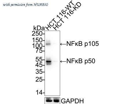 Western blot analysis of NF-kB p105 / p50 on different lysates with Rabbit anti-NF-kB p105 / p50 antibody (HA750060) at 1/5,000 dilution. Lane 1: HCT 116-si NT cell lysate Lane 2: HCT 116-si NFKB1 cell lysate Lysates/proteins at 15 µg/Lane. Predicted band size: 105/50 kDa Observed band size: 105/50 kDa Exposure time: 30 seconds; ECL: K1801; 4-20% SDS-PAGE gel. Proteins were transferred to a PVDF membrane and blocked with 5% NFDM/TBST for 1 hour at room temperature. The primary antibody (HA750060) at 1/5,000 dilution was used in 5% NFDM/TBST at 4℃ overnight. Goat Anti-Rabbit IgG - HRP Secondary Antibody (HA1001) at 1/50,000 dilution was used for 1 hour at room temperature.