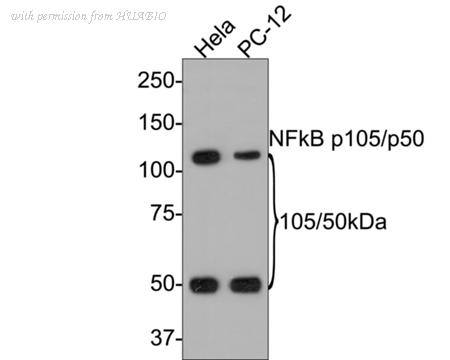 Western blot analysis of NF-kB p105 / p50 on different lysates with Rabbit anti-NF-kB p105 / p50 antibody (HA750060) at 1/500 dilution. Lane 1: Hela cell lysate Lane 2: PC-12 cell lysate Lysates/proteins at 10 µg/Lane. Predicted band size: 50/105 kDa Observed band size: 50/105 kDa Exposure time: 2 minutes; 8% SDS-PAGE gel. Proteins were transferred to a PVDF membrane and blocked with 5% NFDM/TBST for 1 hour at room temperature. The primary antibody (HA750060) at 1/500 dilution was used in 5% NFDM/TBST at room temperature for 2 hours. Goat Anti-Rabbit IgG - HRP Secondary Antibody (HA1001) at 1:300,000 dilution was used for 1 hour at room temperature.